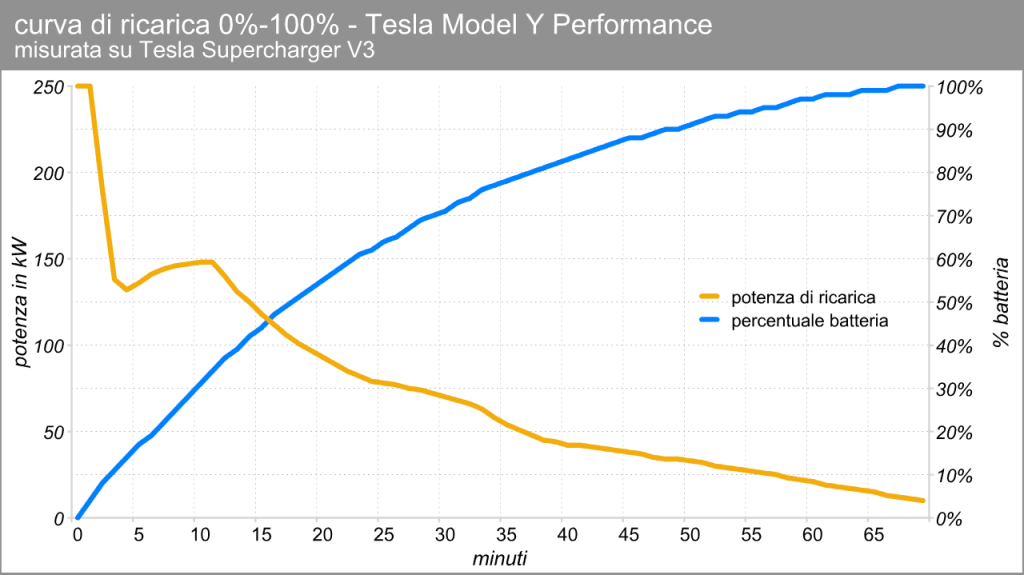 Quando si ricarica un’auto, è importante sapere che la potenza di ricarica non è sempre costante nel tempo. Può variare, oltre che in base alla potenza della colonnina, a seconda di temperatura, potenza massima e capacità della batteria del singolo modello di auto, ma soprattutto in base allo stato di carica: sotto il 50% di capacità della batteria, la ricarica avviene a una potenza prossima al massimo, mentre andare oltre quel livello comporta un graduale ma significativo abbassamento della potenza.